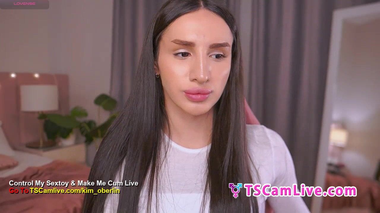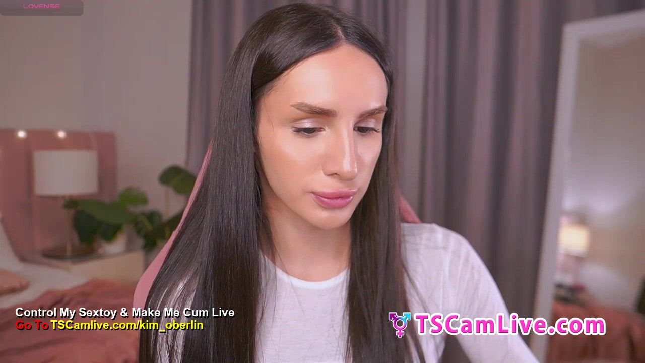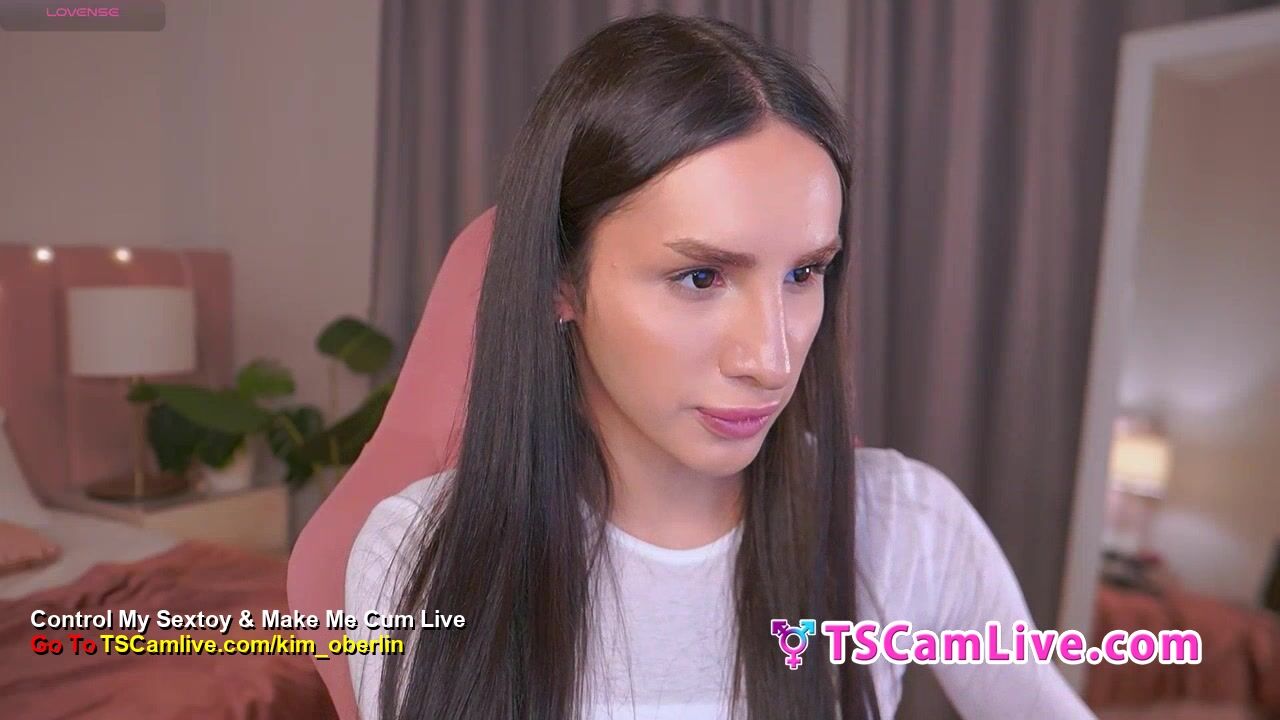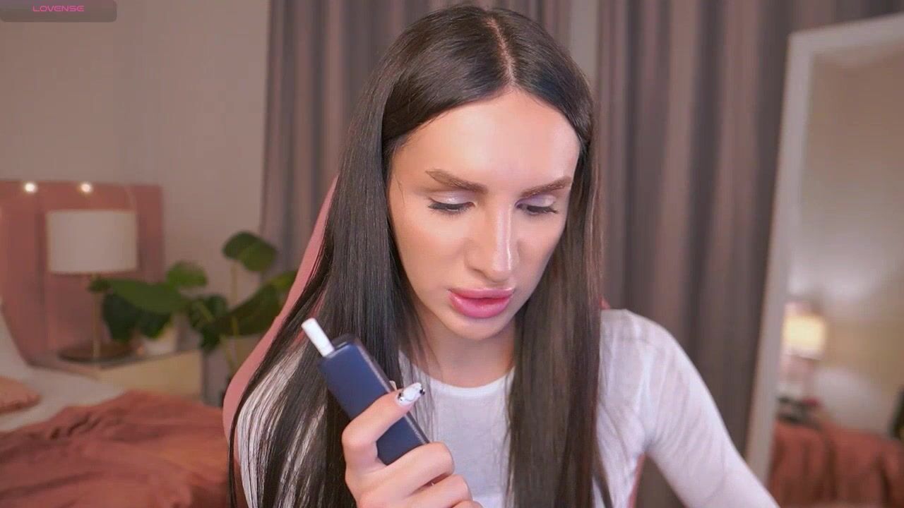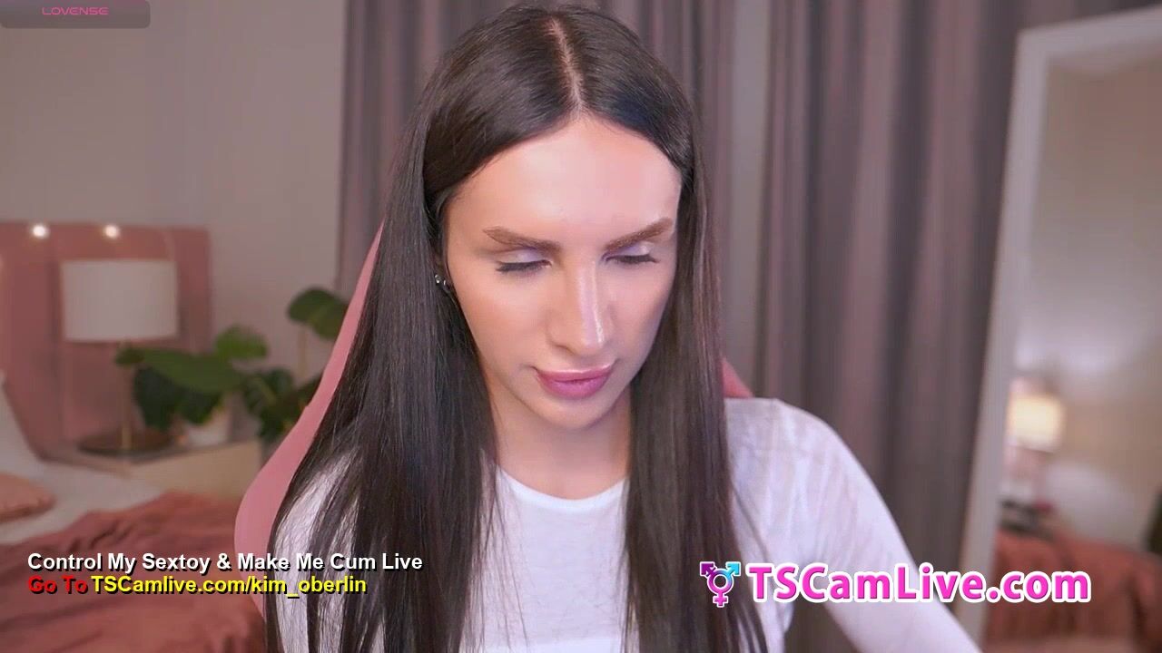 Gorgeous long-haired shemale babe, tattooed and fit, plays with a massive brown dildo. Close-up POV captures her hands gripping and stroking it between her legs, white crop top and panties pulled aside. Seductive expressions and teasing motions in a pink chair setting. Part 6