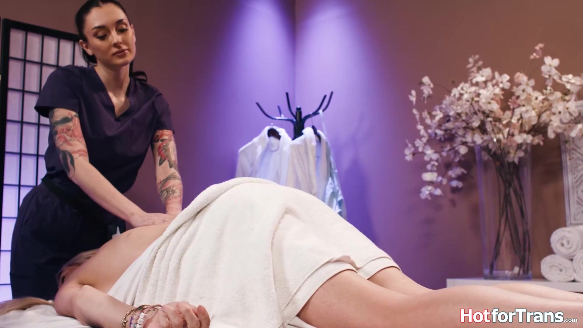 Busty shemale Aubrey Kate is offered a happy end massage for tattooed masseuse Charlotte Sins.The sexy babe deepthroats the big tits tgirls tranny dick and gets her pussy licked.The blonde tranny puts her cock up her ass and anal barebacks her