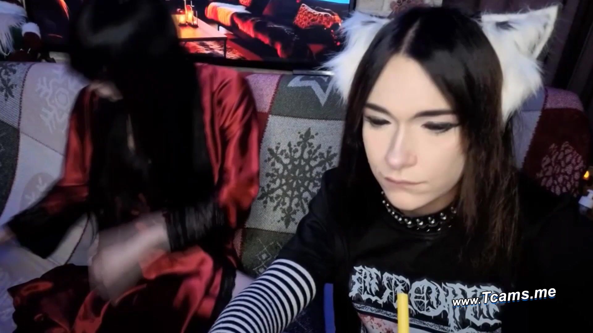In a dimly lit, cozy room bathed in the soft glow of the TV, a stunning woman in a glossy red satin dress lounges seductively on a patterned sofa next to a gorgeous transwoman wearing a black metal band tee, striped arm sleeves, and a sleek choker. The transwoman playfully points at the camera while the babe leans in close, their long dark hair cascading over their shoulders. During their steamy live webcam show on tcams.me, things quickly heat up: the transwoman teasingly shows off her feet as the babe sensually caresses and plays with them. The passion escalates into an intense finale as she eagerly licks and rims the transwoman’s ass in passionate, hungry worship.